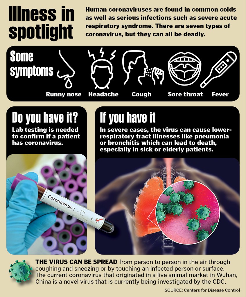 According to the CDC, patients with COVID-19 have reportedly had mild to severe respiratory illness. Symptoms may appear 2-14 days after exposure and include fever, cough and shortness of breath. Call your healthcare professional if you develop symptoms and have been in close contact with a person known to have the disease or if you have recently traveled from an area with widespread or ongoing community spread of the disease.
